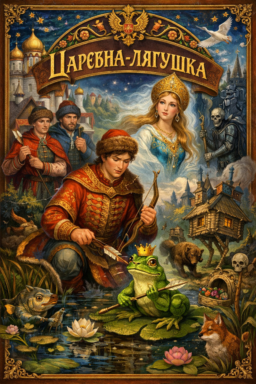 ВолшебныеЦаревна-лягушкаИван-царевич женится на заколдованной лягушке, которая оказывается мудрой красавицей Василисой, но по его ошибке она исчезает, и ему приходится отправиться в далёкое путешествие.