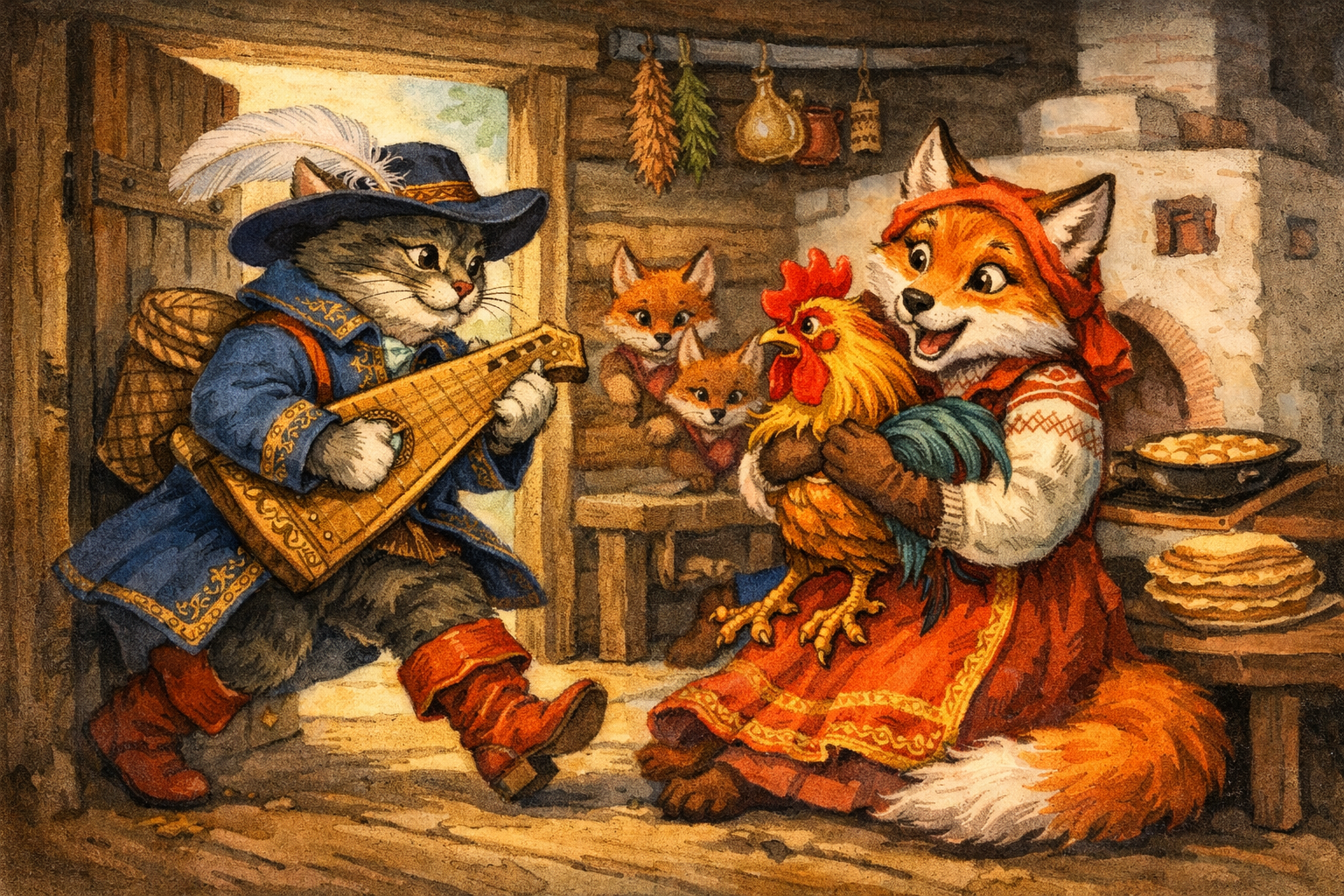 О животныхКот, петух и лисаНародная сказка о доверчивом петушке, хитрой лисе и верном друге, который приходит на помощь вовремя.
