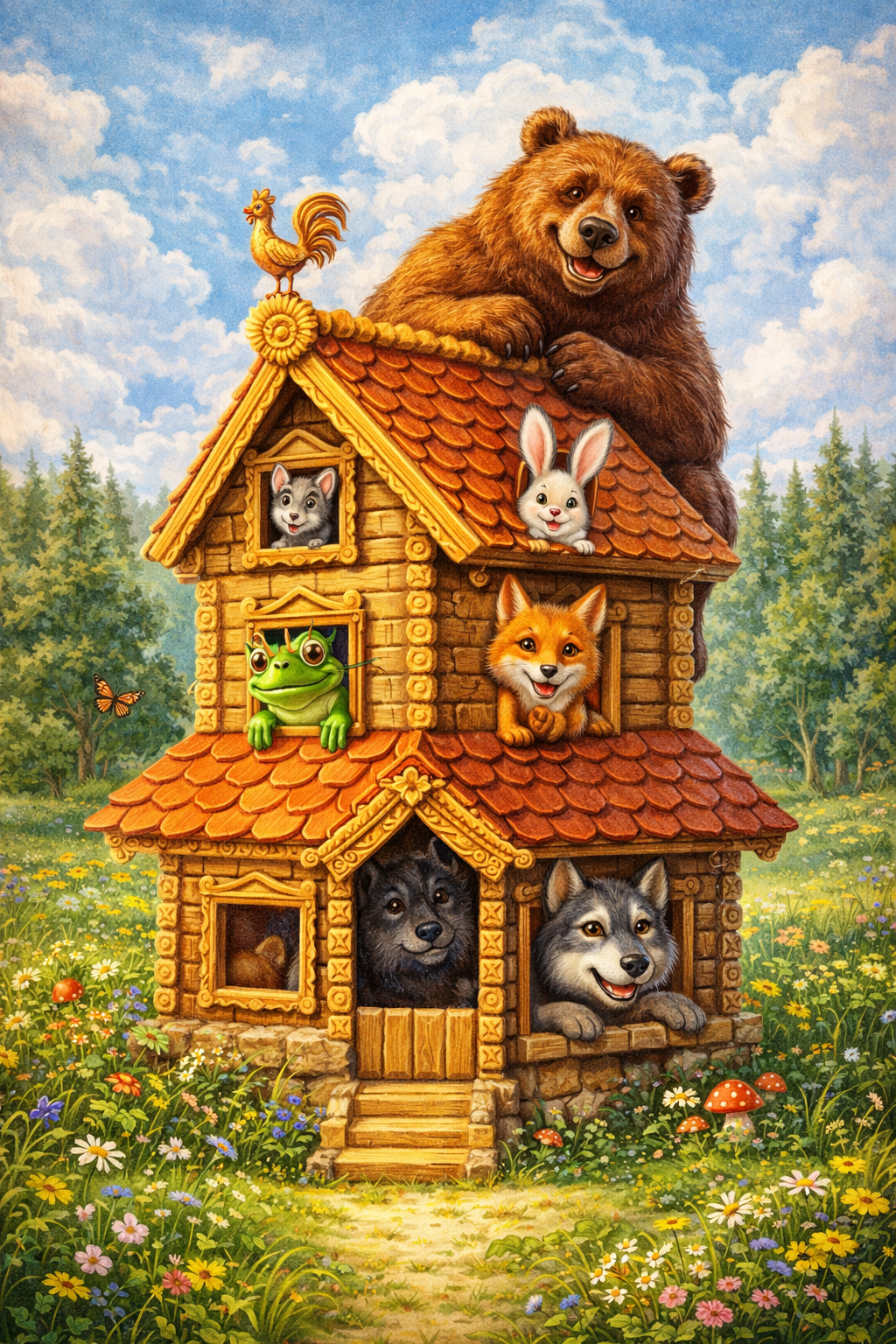 О животныхТеремокВ теремке постепенно поселяются разные звери, живя дружно и весело, пока медведь не разрушает их дом. Однако звери не отчаиваются и вместе строят новый, ещё лучше прежнего.