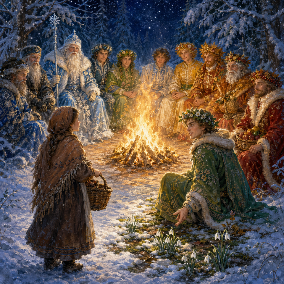 Пошла она на огонёк. Шла, шла и вышла на полянку. Посреди полянки большой костёр горит, а вокруг костра сидят двенадцать братьев, двенадцать месяцев. Сидят и тихо беседуют.