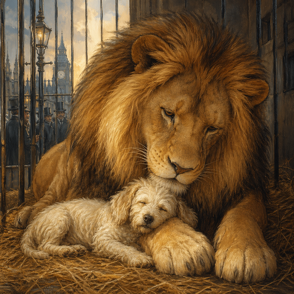 С тех пор собачка жила в одной клетке со львом, лев не трогал её, ел корм, спал с ней вместе, а иногда играл с ней.