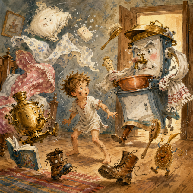 Весёлая и поучительная сказка в стихах о Мойдодыре, который учит грязнулю чистоте и порядку. Яркая, озорная и запоминающаяся история о важности умывания, аккуратности и любви к чистоте.